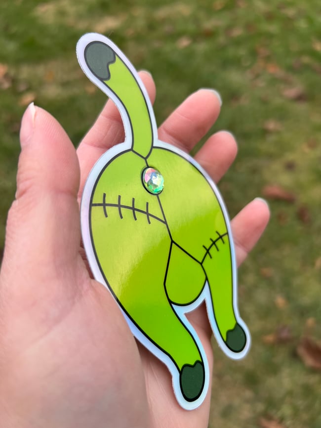 An iridescent green butthole jewel was gorilla glued onto the sticker for a strong hold. Although the glue is rated for the elements, I would still use caution if attaching to a surface that will frequently get wet. I would most recommend using these butthole stickers on a dry surface that will not frequently get knocked around or bumped into (just incase).