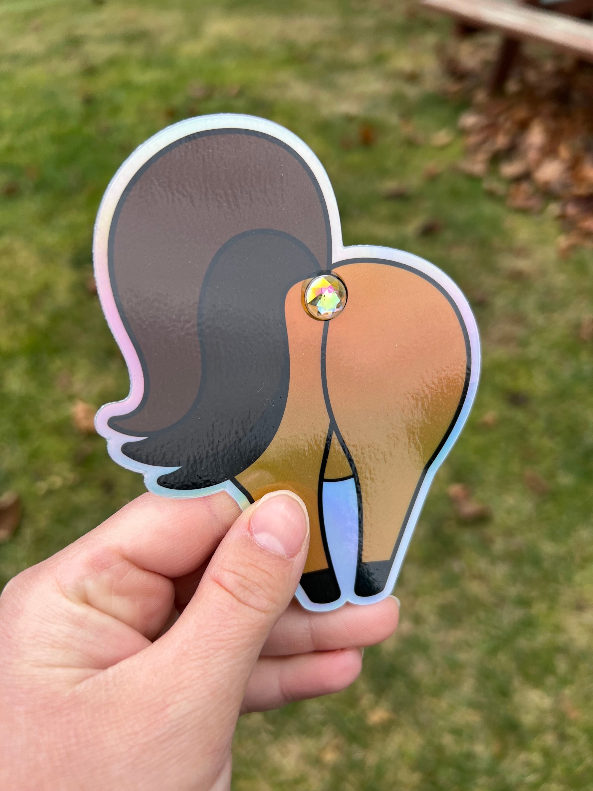 An iridescent champagne butthole jewel was gorilla glued onto the sticker for a strong hold. Although the glue is rated for the elements, I would still use caution if attaching to a surface that will frequently get wet. I would most recommend using these butthole stickers on a dry surface that will not frequently get knocked around or bumped into (just incase).